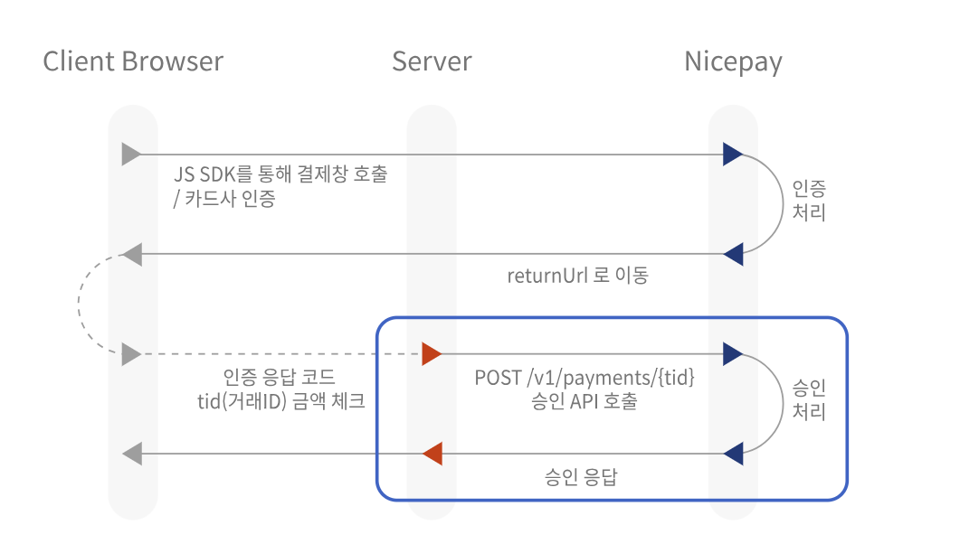 일치한다면, 빙봉상점의 클라이언트 or 서버는 결제를 승인하라는 API 요청을 다시 나이스페이에 보낸다.