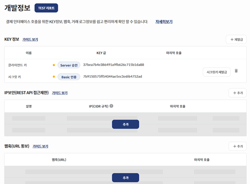 클라이언트 키: 클라이언트에서 결제 창을 띄울 때 쓰는 공개 키